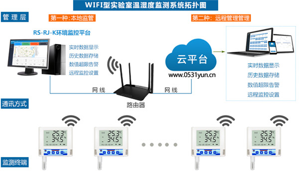 實(shí)驗(yàn)室溫濕度監(jiān)測(cè)系統(tǒng)由監(jiān)測(cè)終端、通訊方式、應(yīng)用層組成。WIFI型多探頭溫濕度記錄儀是系統(tǒng)的監(jiān)測(cè)終端,采用一機(jī)多點(diǎn)的布置方式,也可以多機(jī)多點(diǎn)監(jiān)測(cè)的布置方式,可實(shí)現(xiàn)24小時(shí)不間斷在線監(jiān)控,數(shù)據(jù)異常后現(xiàn)場(chǎng)聲光報(bào)警,短信報(bào)警,APP報(bào)警,郵箱報(bào)警等功能。