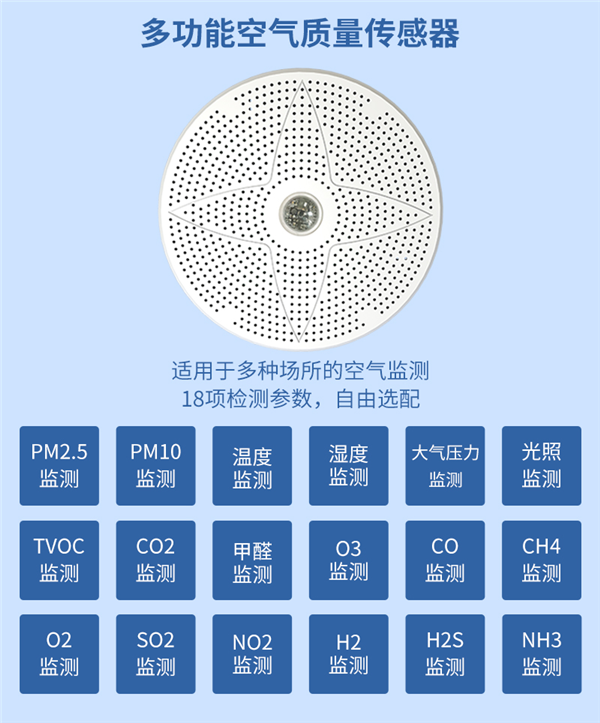 多功能空氣質(zhì)量傳感器能同時(shí)監(jiān)測(cè)十一種環(huán)境要素,可在溫度、濕度、PM2.5、PM10、大氣壓力、光照、TVOC、CO2、甲醛、O3等十種環(huán)境要素中至多選擇八種要素,并搭配CO、CH4、O2、SO2、NO2、H2、H2S、NH3中的三種氣體進(jìn)行監(jiān)測(cè)。
